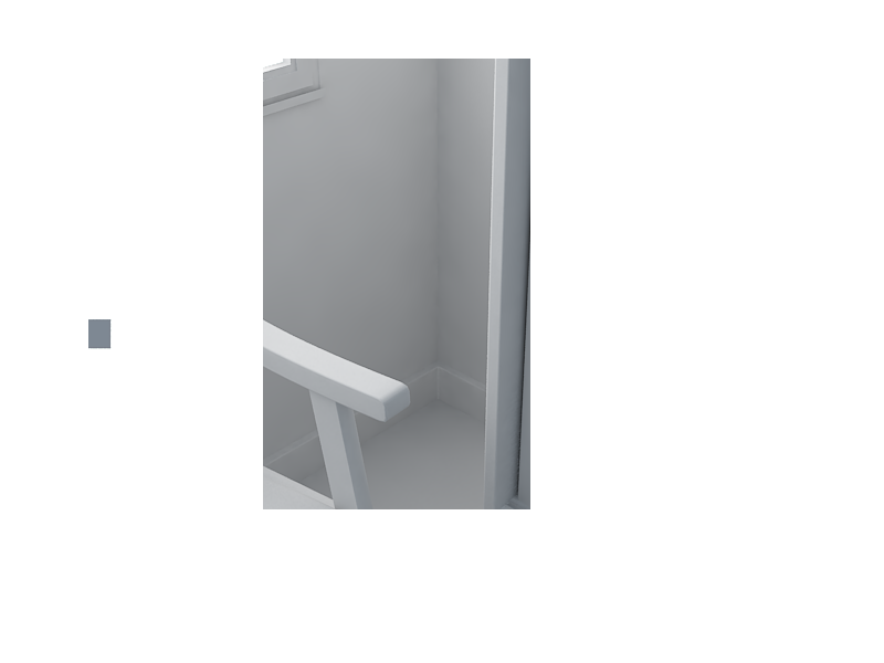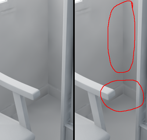 Pero el problema está en la sombras, sobre todo en las que existen en rincones y huecos pequeños, ya que quedan como corros de sombra cómo se puede ver en la imagen que adjunto. La ventana está encima de la silla, se ve en la imagen que asoma un trozo del marco. También decir que los objetos están completamente rectos.