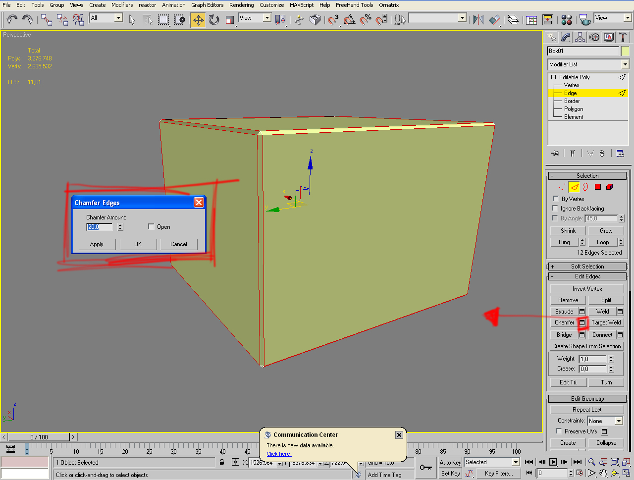 Es para cualquier modelo en general, en un objeto poly seleccione en modo edge, seleccione los Edges que quieres biselar pinchas en chamfer y solo te hace un bisel de 2 Edges.
