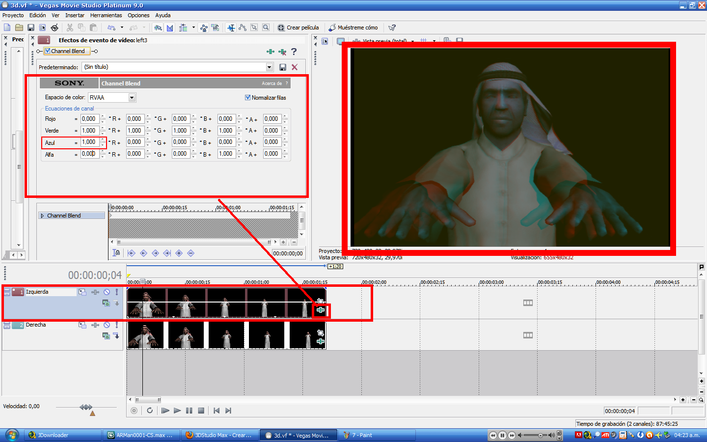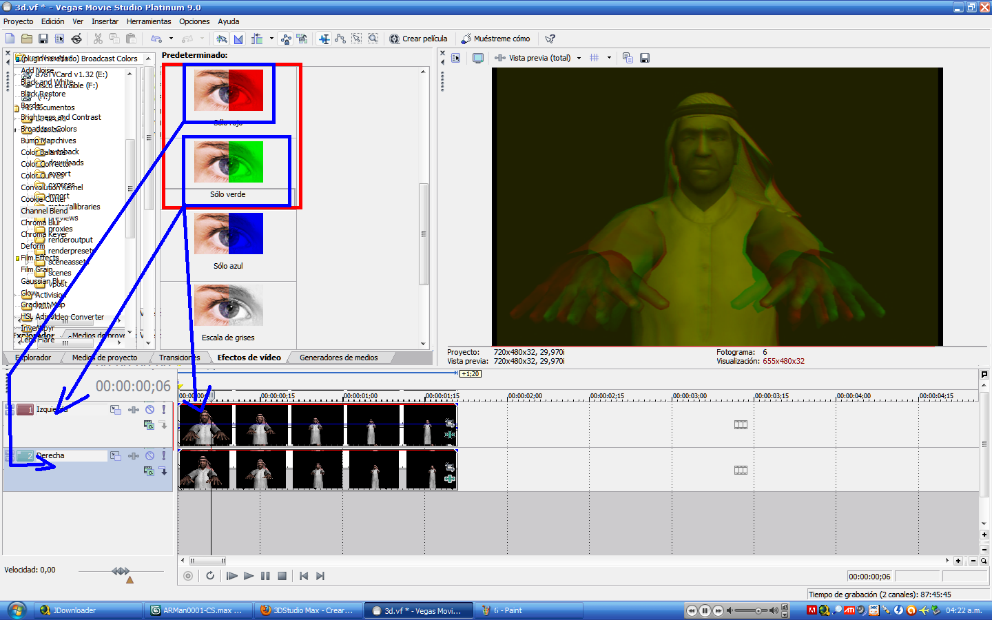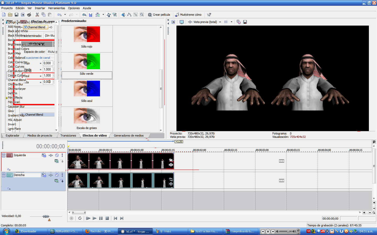 Y elegimos el color a cada video. Ojo: el rojo tiene que ir en el ojo derecho, o dependiendo de tus anteojos 3d. Y veremos este horrible resultado.