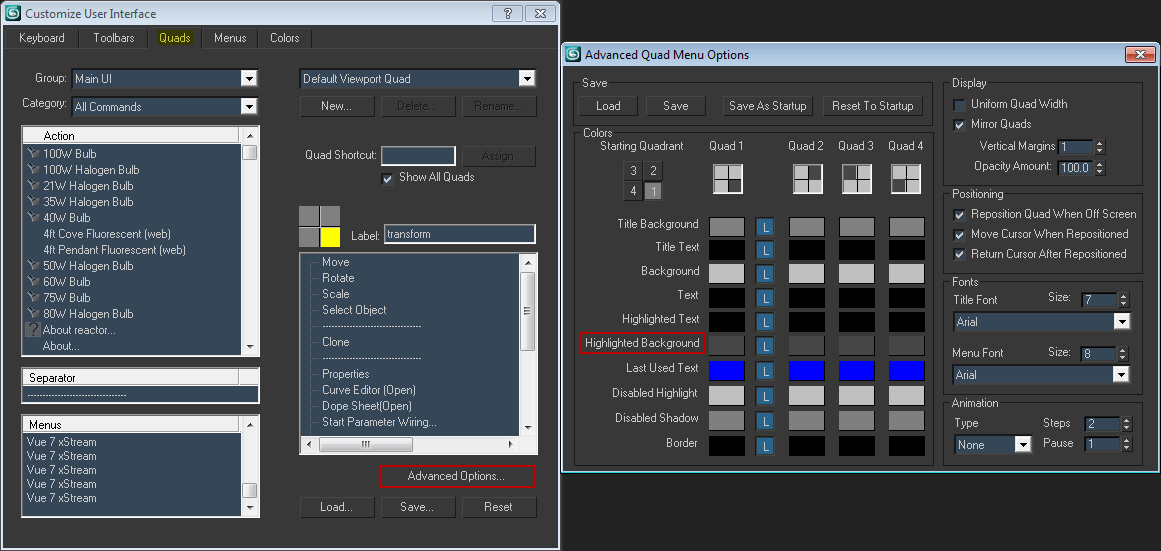 Hola amigos. He buscado por casi todos los hilos, pero no encuentro algo referente a lo que quiero hacer, estoy con 3ds max11 y me gustaría cambiar el color a los cuadros de selección cuando nos desplazamos sobre distintas opciones a escoger. Sé debe estar en customize interfaz pero la verdad mi inglés es más bien malucho, vaya malo de verdad y, bueno, no lo veo.
