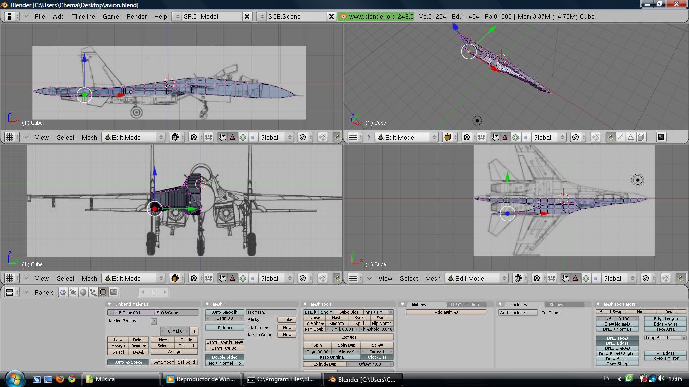 Hola, en primer lugar gracias por prestarme vuestro tiempo. Veréis llevo unas semanas iniciándome en el modelado de Blender y estoy realizando el modelado de un avión. Tengo hecho casi todo el fuselaje realizado, aunque me he leído bastantes tutoriales todavía hay muchas técnicas que desconozco y hay cosas que no sé cómo afrontarlas. Os pongo el archivo para que me echéis una mano de lo que debería arreglar. Lo que no sé cómo hacer es la carlinga (el interior no quiero que tenga mucho detalle, lo único que quiero es que tenga los cristales), las toberas de los motores y la entrada de aire de los motores. Como veréis lo que es la salida del motor no la he modelado porque había pensado realizarla aparte y después pegarla, pero no sé si es una buena idea o me he equivocado en esa decisión tpor ahora lo único que tengo conocimiento es hacer cubos y extruirlos que con eso es con lo que he trabajado hasta ahora. Las curvas de Bézier leí en este mismo foro que era más recomendable centrarse en la técnica que estoy empleando. Muchas gracias y un saludo.