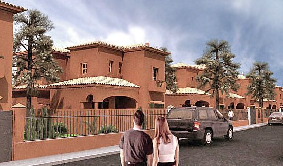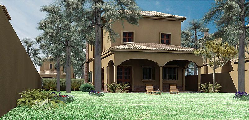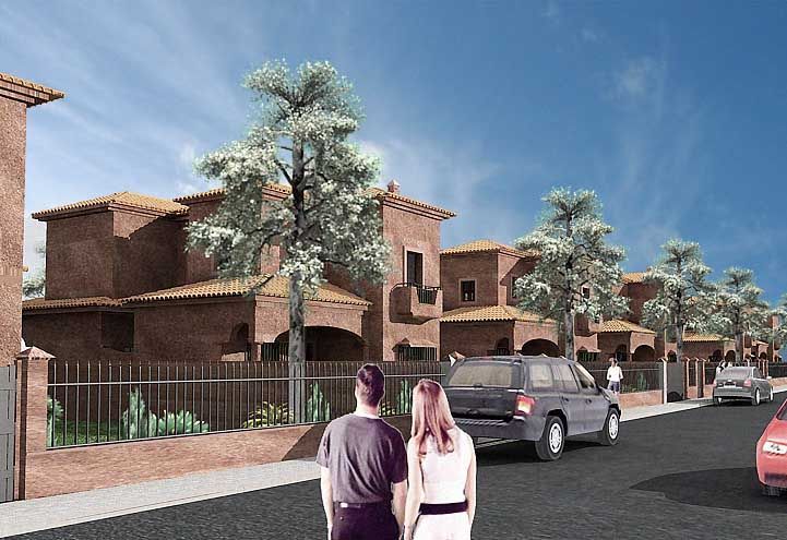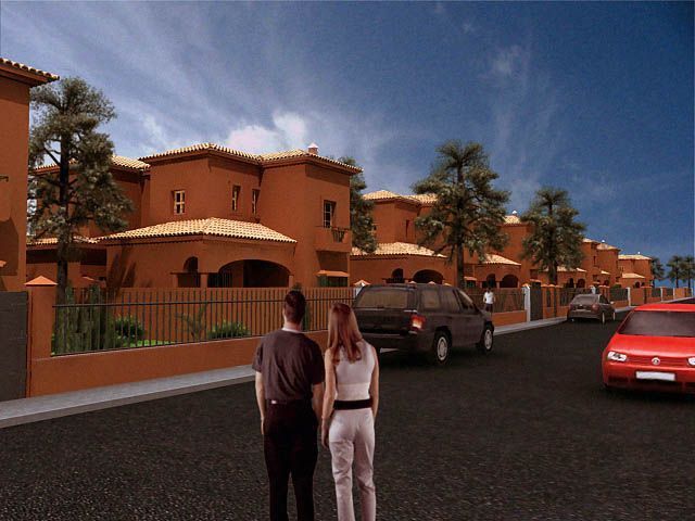 Buenos días, aquí publico una imagen de una promoción de Chiclana, que me ha dado muchos dolores de cabeza no por lo complicado si no por los problemas del cliente que lo único que quiere es verlo terminado y e cambiado partes de los chalets 5 veces hasta quedar así y aun así tiene fallos por que el pino que buscaba que es el típico de esta zona no lo he encontrado y creando mapas de opacidad no le gustaban. Otra cosa es la iluminación no sé que le a pasado al modelo que al iluminarlo me creaba sombras muy raras, en fin, un show. Bueno espero que me matéis a críticas mu esto la perspectiva que más problemas me ha dado y la que menos me convence.