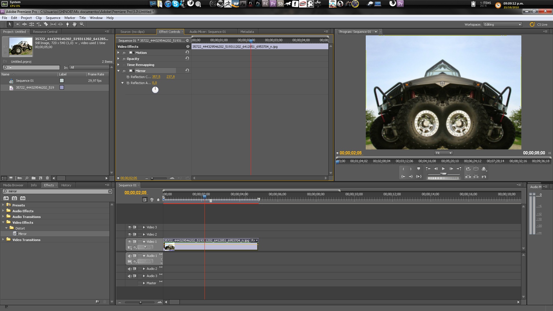 Hola no sé si tendrás el programa en inglés o español yo lo tengo en inglés y en la sección de efectos hay uno que es el que buscas se llama mirror anexo te mando una imagen que realice para que lo veas allí puedes mover los parámetros para que se vea la imagen como quieres ya que por defecto el ángulo del mirror esta a la derecha fuera de cuadro y tu lo necesitas es en el medio de todas formas, como te comente en la imagen esta tal cual lo necesitas. Espero te funcione, saludos.
