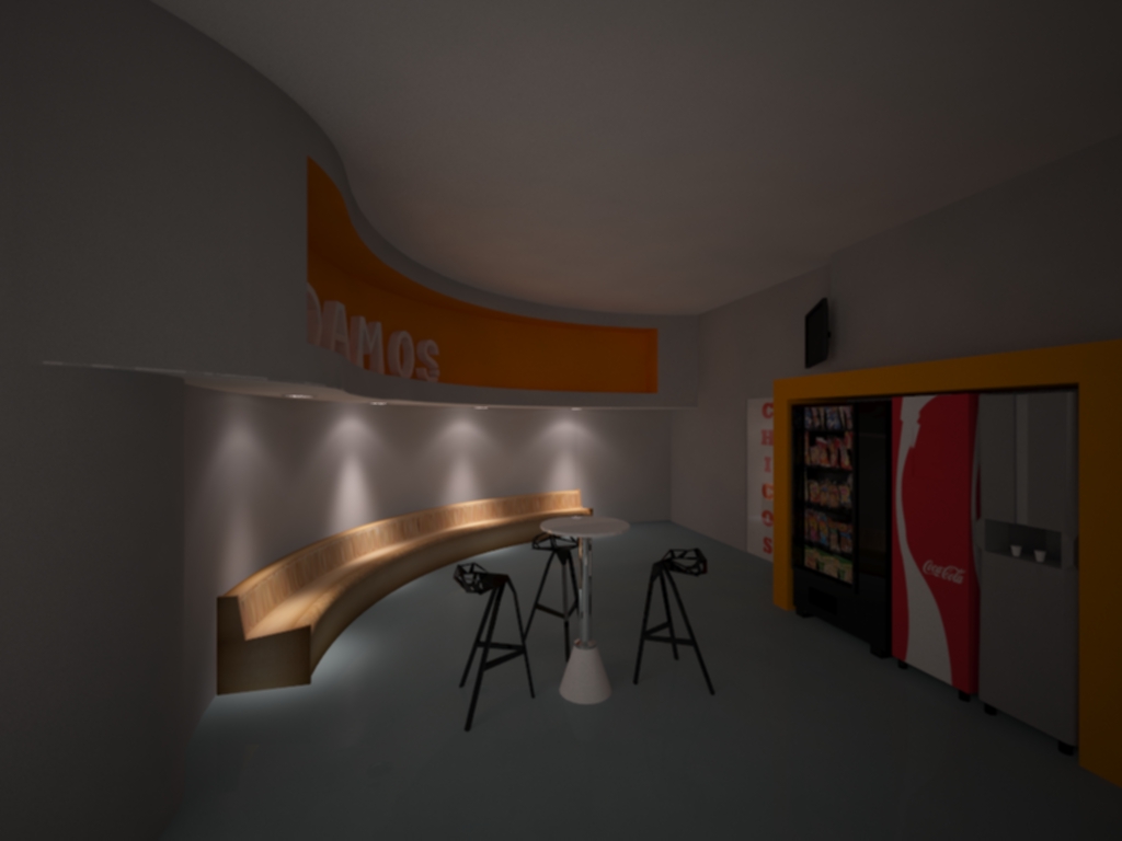 Mluke muchas gracias por comentar, el problema es que no fui yo quien elegio la zona a renderizar sino que en el anteproyecto fue el profesor quien eligió el lugar que debía sacar. El tema de la iluminación es un mundo aparte soy muy novato para controlaro, la cosa es que los renders del proyecto final deberíamos hacerlos con AutoCAD que es el programa que utilizamos en clase, pero me parece que sus acabados son demasiado sencillos y quería dar un poco más de trabajo a mis imágenes, lo de la derecha enmarcado en naranja son una máquina de commida y dos de café, están por modelar aún. (no sé cómo las modelare).