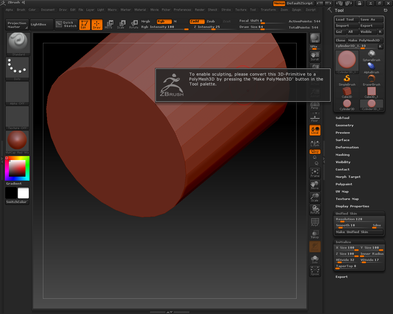 Bueno hola mi problema es el siguiente hago un objeto en ZBrush y cuando lo voy a modificar me tira el aviso de make polymesh3d presiono en el menú de herramientas esta opción procedo a deformar el objeto y me tira el mismo aviso y me tiene con la paciencia salida ya que hasta ahora estoy aprendiendo y esto es bastante molesto si quiero usar una forma básica tengo que hacerla previamente en Maya y después importarla alguien me puede ayudar tengo la versión demo del programa no sé si eso tenga que ver, pero bueno hay les dejo el dato para quien me quiera ayudar.