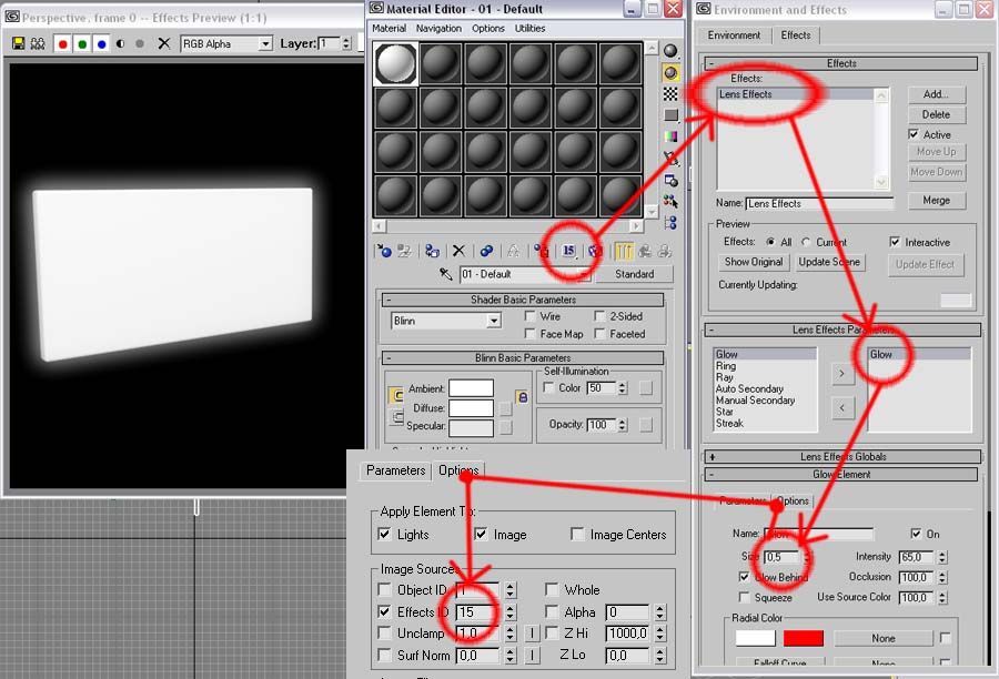 Básicamente pingo un nimero id al material, en este caso use el 15 pero puede ser cualquiera, luego en el cuadro de efectos añadí un Lens Effects y en la pestaña parameters un Glow, modifique el tamaña y la intensidad (a gusto) y luego en la pestaña opciones marque effects id y le di el número que le asignamos al material, en este caso el 15. Saludos.