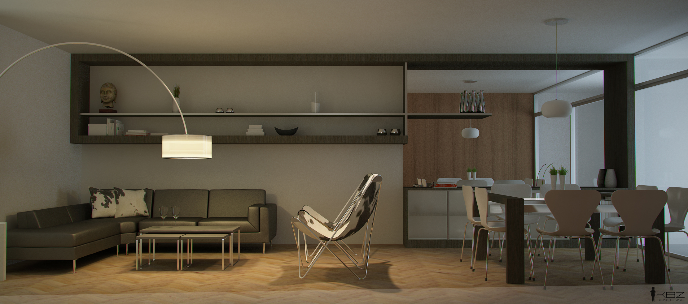 Lo siguientes renders sinceramente no me gustan mucho, no por el render en sí, sino por tu punto de vista. Por ejemplo, en el segundo creo que has elegido un punto de vista de los peores que se podrían haber cogido a no ser que quieras enseñar la bola y su efecto traslúcido. No mucho más que comentar, solo se luce el sofá, la bola y mesa. La tercera imagen está bien, es típica de las revistas de arquitectura, como espacios semi-imaginarios, oníricos. Bueno, si alguien no entiende de arquitectura a lo mejor le gusta muchísimo la imagen. La cuarta fotografía, el punto de vista también, si desplazas la cámara un poco hacia la izquierda y la subes un poco no queda la pared de enfrente paralela, se ven los fondos de armario mejor y se gana en profundidad. El tapizado de los cojines es simplemente de mal gusto, pero hay gente para todo. En la cocina has mejorado el punto de vista. Sólo dos cosas, el estrelladito que dejan todas las luces es extraño o al menos en todas y si le cambias el suelo a uno un poco más oscuro, grisáceo quizás, ganaría mucho más la imagen.