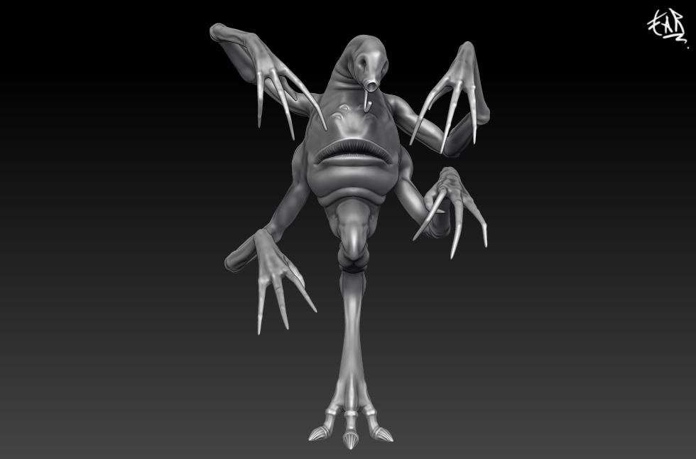 Esta extraña criatura es casi tan alta como un ser humano, pero ahí es donde termina todo parecido. Tiene un cuerpo similar a una bolsa que se aguanta sobre una única pierna poderosa, que termina en un pie prensil. Su rostro está situado en el centro de su cuerpo, con cuatro ojos y una gran boca. Cuatro brazos largos, con articulaciones múltiples, se extienden desde su cuerpo, cada uno terminando unos dedos largos y delgados.