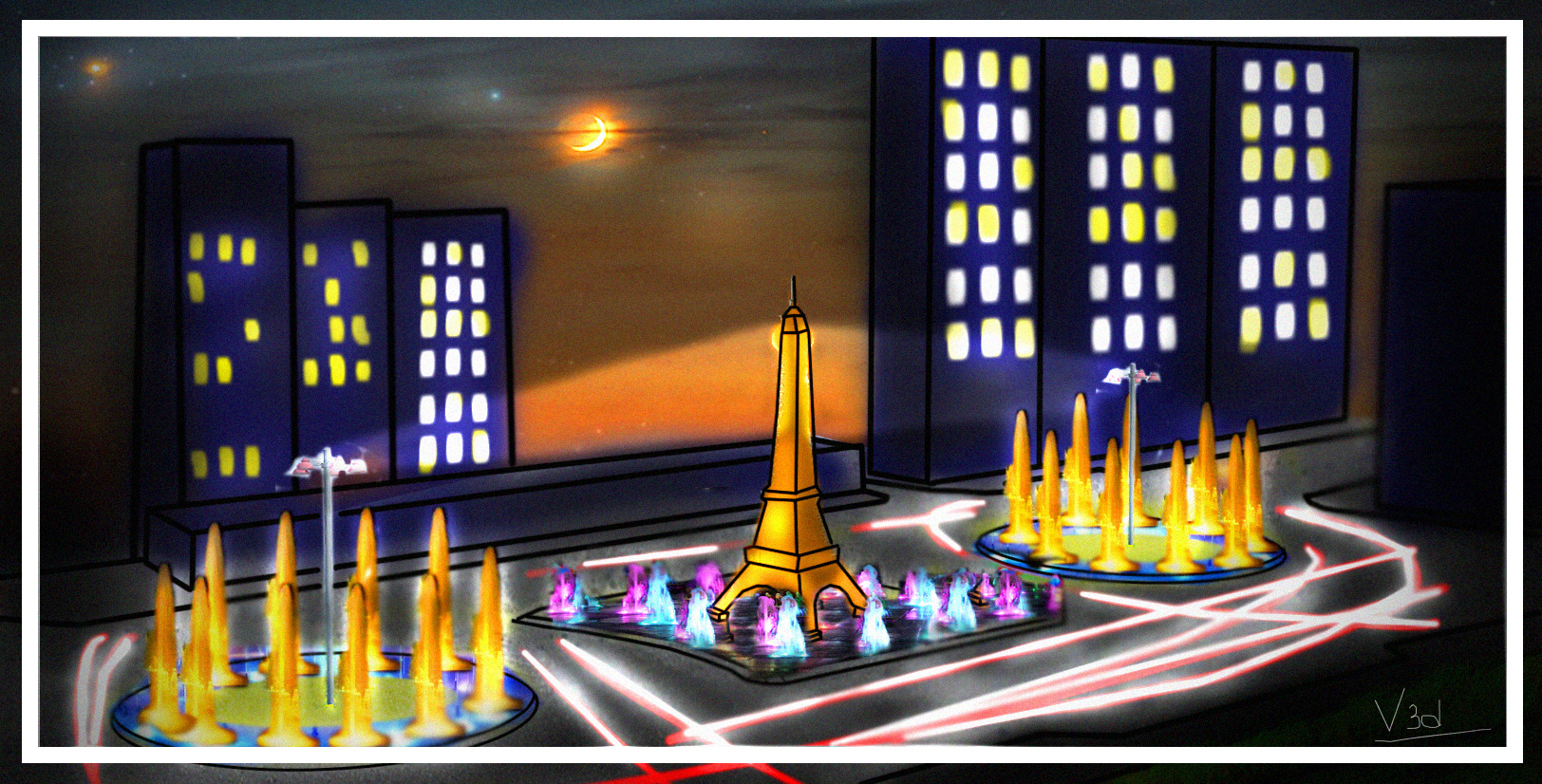 También es la primera vez que hago algo parecido a mattepaint ya que el césped el agua y varias cosas más son mezcla de fotografías y pintado. El dibujo de la Torre Eiffel es simplemente.