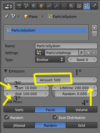 El tercer dato es end: este dato lo he puesto a 100 - Esto quiere decir que cuando llegue al frame 100 caerá el último copo de los 500 que teníamos.