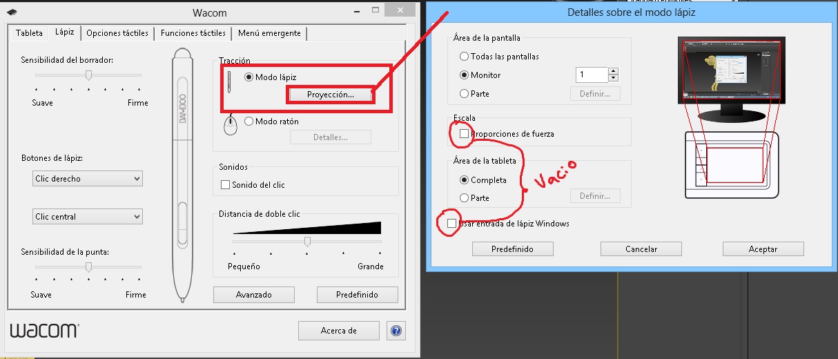 Entramos en la configuración de nuestra Wacom y en la pestaña lápiz buscamos proyección y dentro desactivamos Proyección de fuerza y Usar entrada de lápiz Windows (Adjunto imagen explicando).
