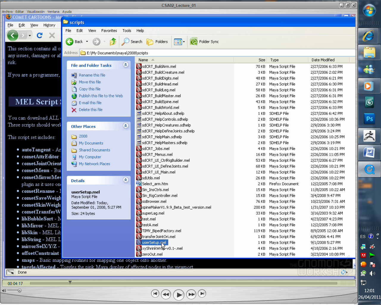 Hola a todos rusientemente me compre un video tutorial de riggnig y en el video me muestra como descargar unos scripts de comet cartoon y bueno el problema que tengo es que para activarlos para visiones superiores a Maya 8 debo modificar una script que se llama usersetup y modificarlo para que el programa lo lea y e hay el problema no encuentro tal script busque en todas las carpetas de scripts, pero no lo encuentro cómo se ve en la imagen al tipo le aparece en scripts, pero en mí versión la 2011 todo está ordenado en carpetas y en ninguna esta cómo puedo solucionar este problema para activar el scripts tengo que crearlo y como hago eso por favor ayuda. http://www.comet-cartoons.com/Maya.html.