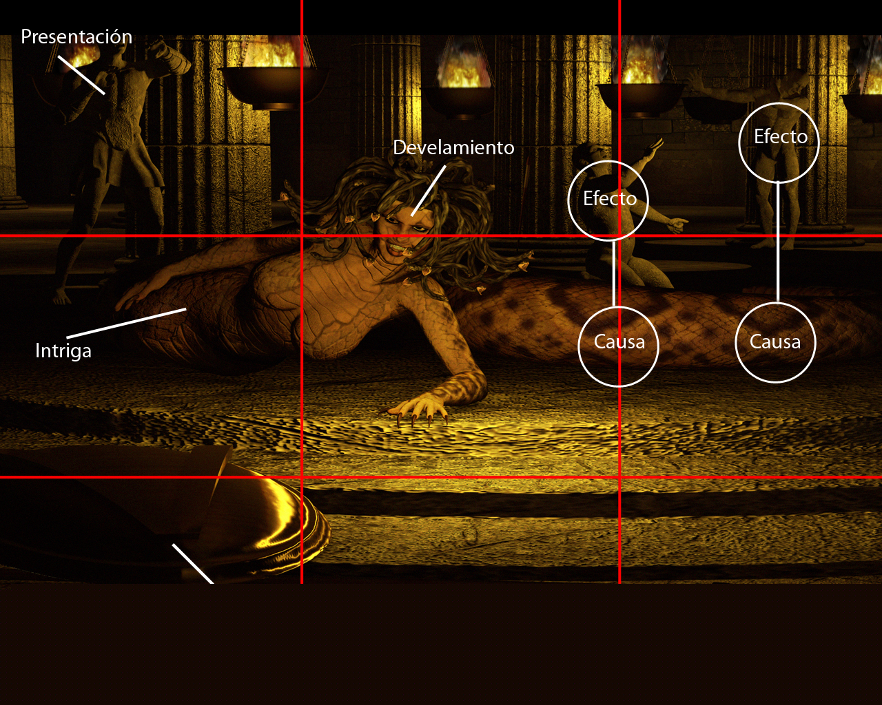 Una mejor disposición sería del escudo tal y cómo está, pero a la derecha, para que sea el palo izquierdo de la v del escudo el que te dirige a la medusa, y el derecho te dirija hacia alguno de los hombres de piedra de la derecha casi en vertical. Así realmente reforzarías la direccionalidad de lo que quieres contar. Y la lanza la reposicionaría para que sólo se viera quizá un poco por la izquierda apuntando hacia la cola de medusa, para señalar de dónde viene el daño.