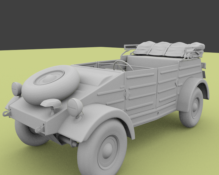 Hola a todos, os dejo aquí el modelo con el que me estoy peleando, es un kubelwagen type 82 de la segunda guerra mundial, hace un tiempo que no modelo en Blender, a ver si retomo un poco la practica, la intención es hacer un Time Lapse parecido al que hice con la furgoneta de lost, pero esto retrasa el proceso o sea que esto ya se verá, de momento aquí os pongo la primera actualización.