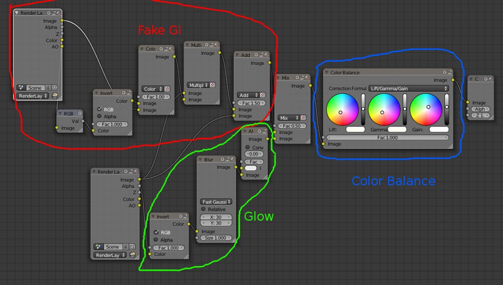 Aquí está el árbol de nodos que utilicé (el momenot donde vienen Caronte y ángelsan a reírse del Víctor), marcado cuáles son para simular el GI, cuales para el Glow (la intención era dejarlo en la ventana, pero no guardé la máscaras), y el nodo de cb para corregir un poco los tonos y la iluminación, que como bien decís, está un poco oscura todavía. Fíjate que para poder hacerlo así separé en los canales de render el canal de color, necesario fundamentalmente para esta técnica de simulación de iluminación global (todavía no lo domino del todo, me falta pulirla un poco más).