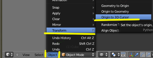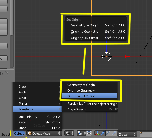 La cuestión es que me gustaría alinear el punto de pivote con uno de los vértices del cubo. Entro en Edit Mode, selecciono el vértice, hago Control + s y selecciono centrar el punto en el vértice, pero cuando cambio a object mode, el punto de pivote no se ha movido. A partir de aquí, todos los tutoriales dicen que hay tres opciones center, center, etc. El problema es que no encuentro el dichoso menú donde salen.