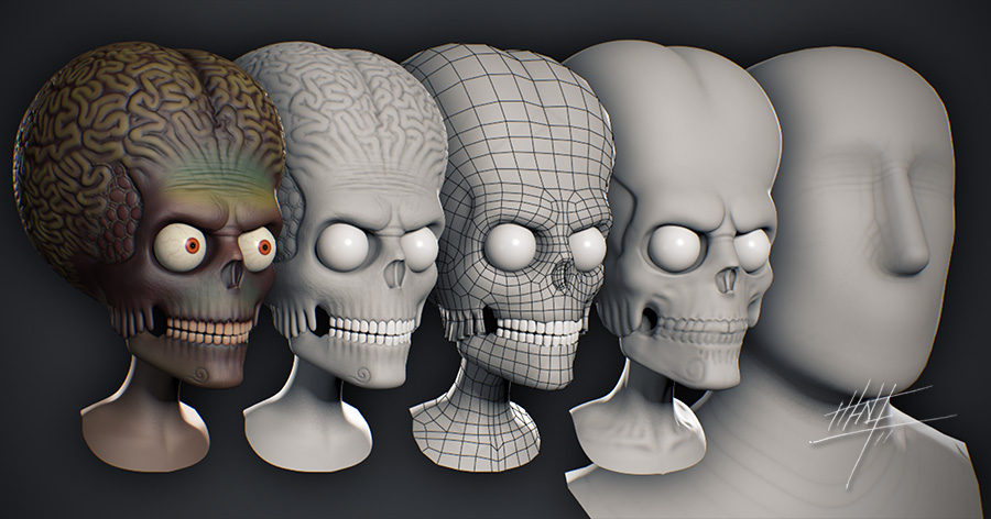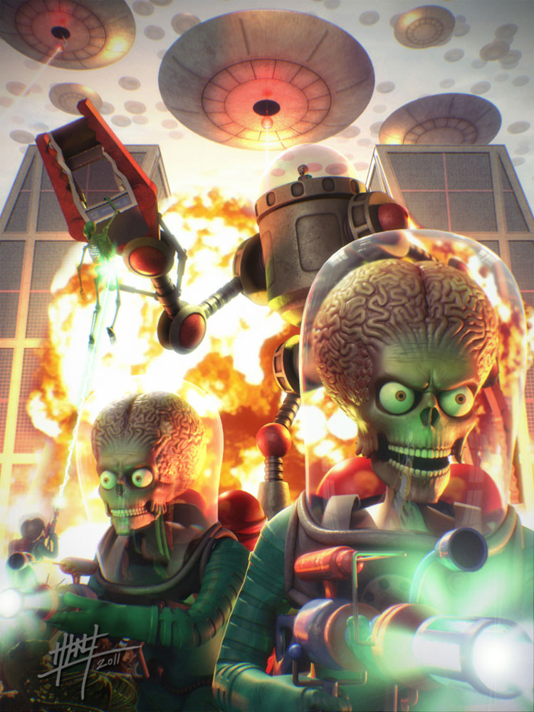 Ésta es una imagen que realicé para el libro space Invaders que se presentó en la semana de cine fantástico de estepona. El libro hace un recorrido por distintas películas sobre invasiones extraterrestres, así que, quise hacer algo divertido sobre la película Mars Attacks. Para realizarla usé 3ds Max, Adobe Photoshop y Mudbox. Saludos.