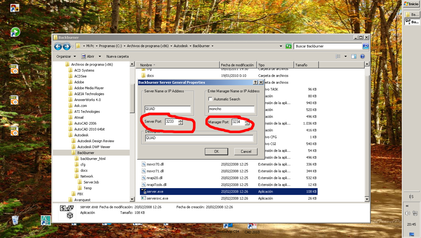 En la ventana del server anda a edit/general settings. Aquí tienes que poner dos direcciones o nombres. El de la propia PC y el del manager (esto en cada PC de la granja. Sácale el tilde a buscar automáticamente y ponlo manual). Si sabes los IP pones esos valores sino pones directamente el nombre de el PC. (inicio/panel de control/sistema/nombre de el PC) si quieres saber que IP tiene esa PC : inicio/ejecutar/ ahí escribis: cmd. Te va a abrir una ventada de dos ahí, done esté el cursor, escribis: ipconfig. Ahí te va a salir que IP tiene esa PC.