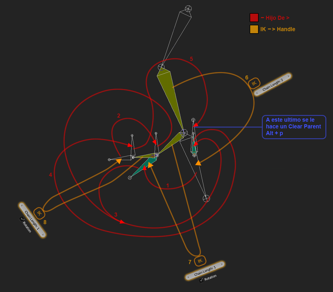 De donde nacen las flechas, son los que llevan el constraint IK, y donde acaban, son los handles.