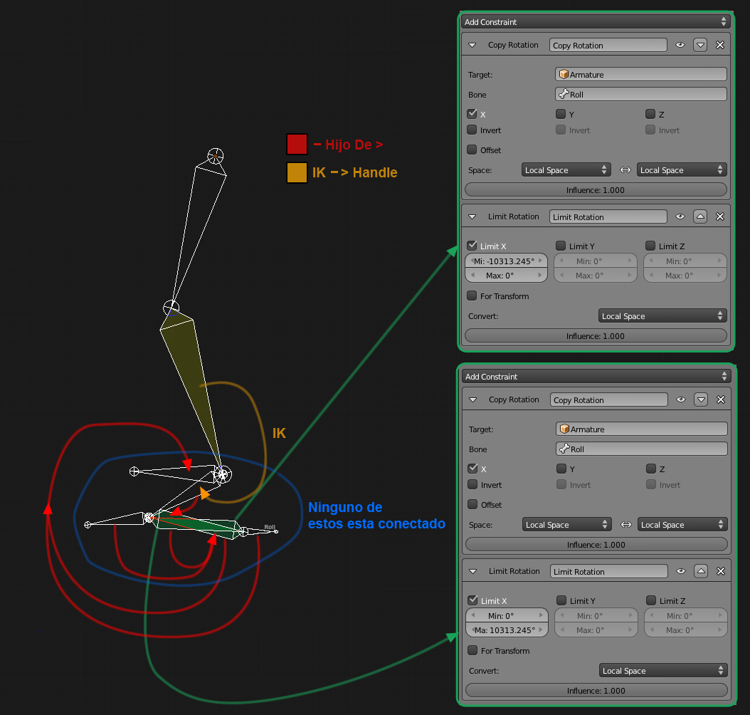 Las flechas verdes apuntan a los settings de los constraints que tienen los huesos verdes.