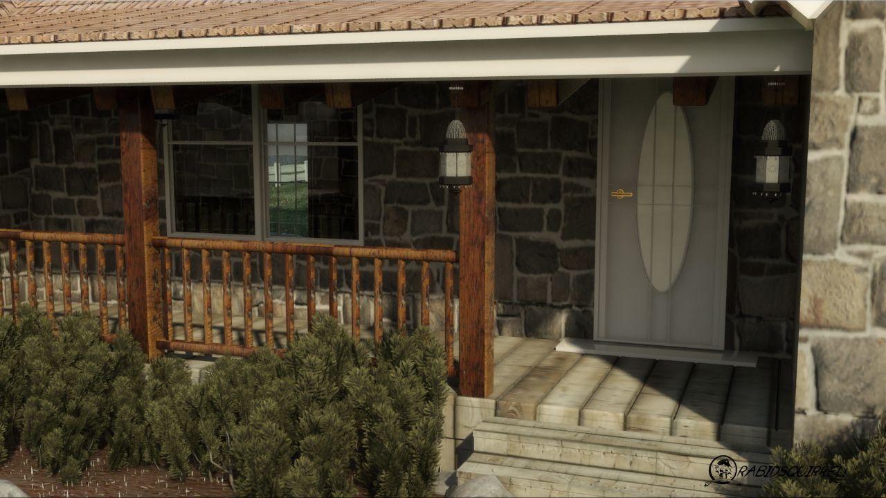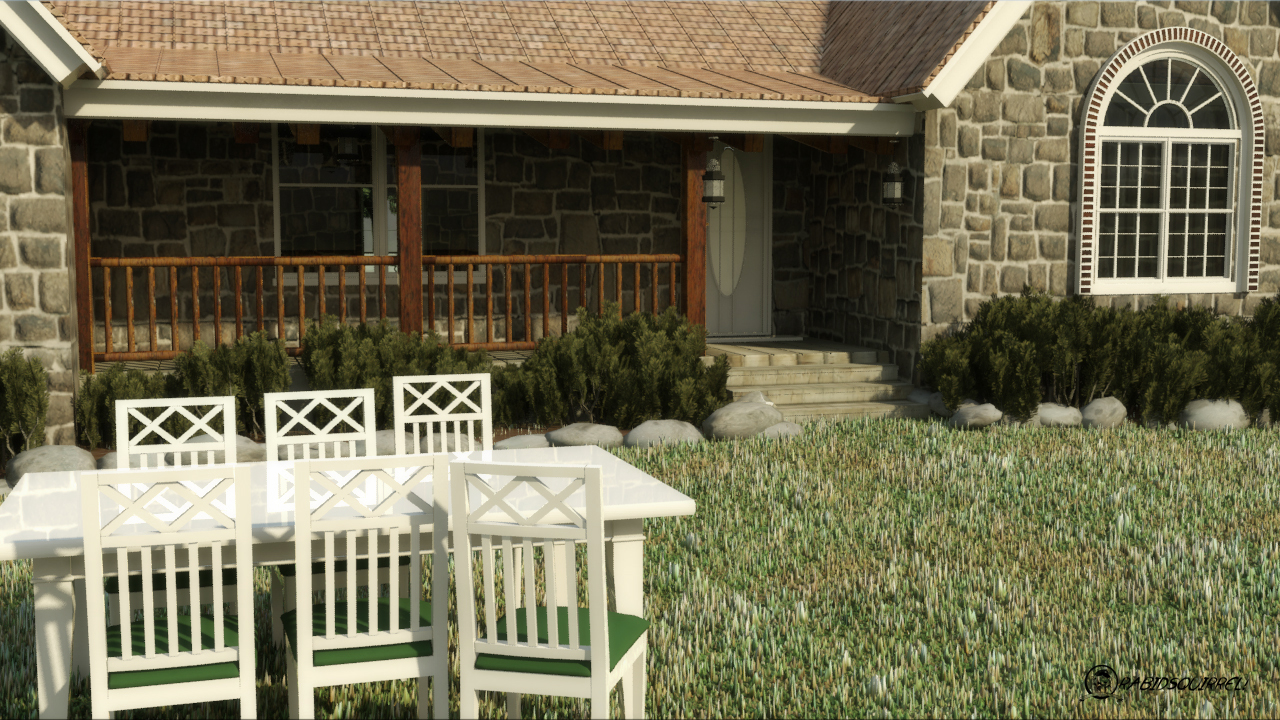 Hola, las dos imágenes en las que se ve todo se ve muy bien, el problema está en las imágenes de cerca. En la segunda imagen, la hierba se ve muy gruesa y muy alta. Las tejas pienso que se pueden mejorar bastante, añadiéndolas un Bump map o habiéndolas modelado un poco. Así tal y como las tienes ahora parecen de videojuego.