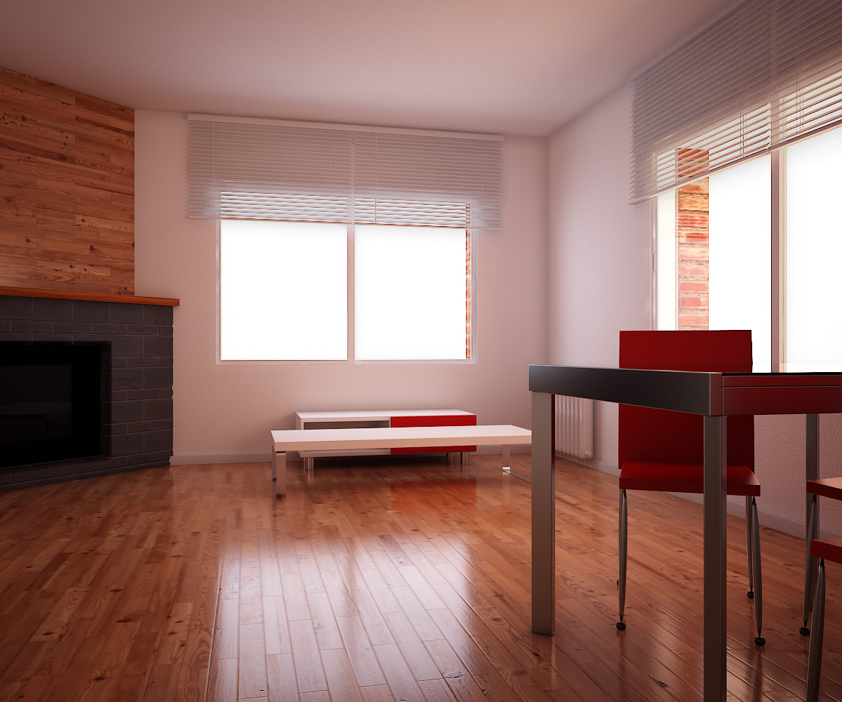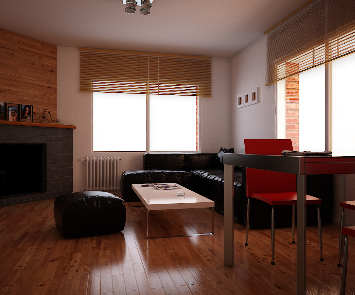 Como ya te han dicho sobre la chimenea, al ladrillo le tienes que subir el Bump y, además tienes que colocar bien la textura, ya que se te corta la primera hilada de ladrillo, el interior de la chimenea no se puede ver negro, la textura de madera del tope se ve muy alargada y, proyecta sombra hacia arriba. Pasa lo mismo con el soporte de los troncos que, aunque la luz venga desde el techo y quizás desde una ventana colocada detrás de la cámara, pues sus sombra se dirige hacia arriba, cuando tenía que ser lo contrario. El fallo es que tienes 2 luces muy bajas: una detrás del sofá y otra detrás de la cámara.