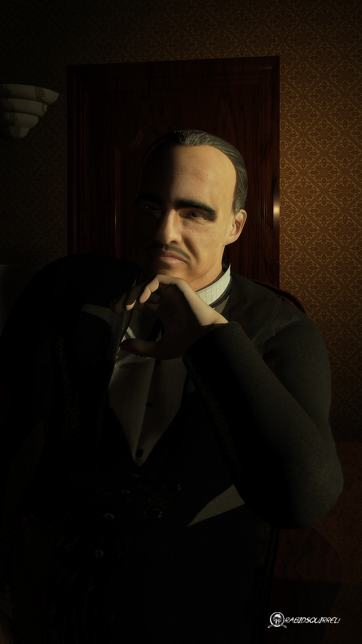 A mí me parece que está muy bien, la técnica de iluminación no sé si la has hecho basado en la luz de la oficina de vito en la película (imagino que el contraste es por eso). Personalmente lo único que le veo es el detalle del pelo, el resto está muy bien.