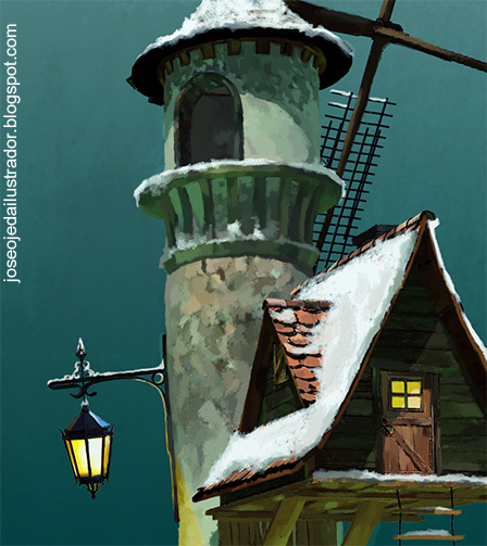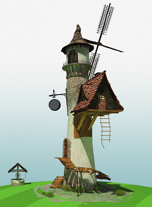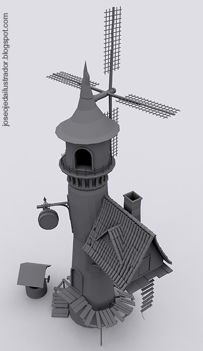 Cómo lo haces, tiras el render y luego pintas encima, ¿no? Me gusta muchísimo el diseño del molino, sobre todo las tejas, escalerillas y tableros descolocados y movidos.