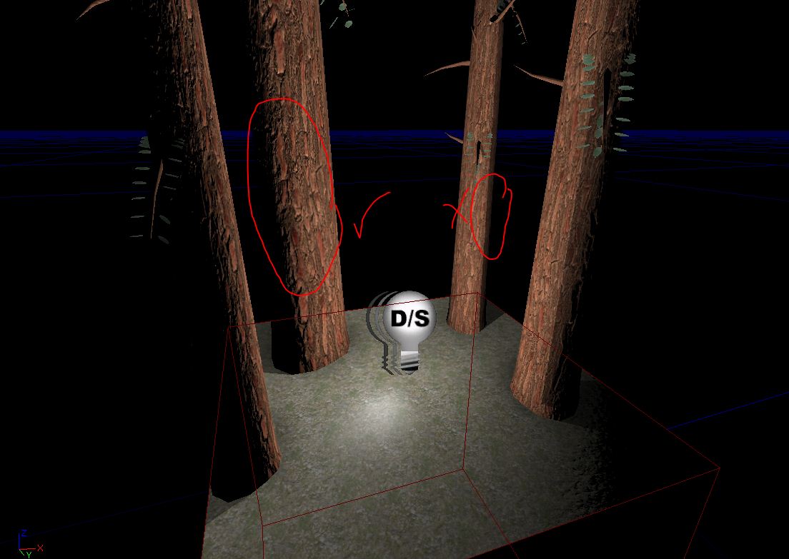 -El error del que he hablado, que apreciareis en la imagen adjunta que esta iluminada con una dinamic light. En ella he marcado con un tic el efecto que quiero que se de en todas las partes de los static Mesh, y con una cruz el efecto de textura plana que se crea. De todas formas, la mejor forma de apreciar este error es murando el material del suelo, la luz está situada en el medio, y el relieve por la sombra solo se aprecia en la esquina de abajo a la derecha. Si fuera el suelo más grande, apreciariais que esa sombra forma una línea recta. ¿alguien sabe cómo solucionar esto?