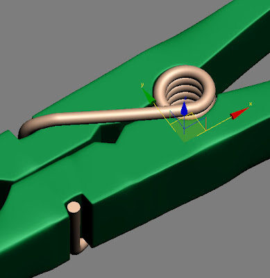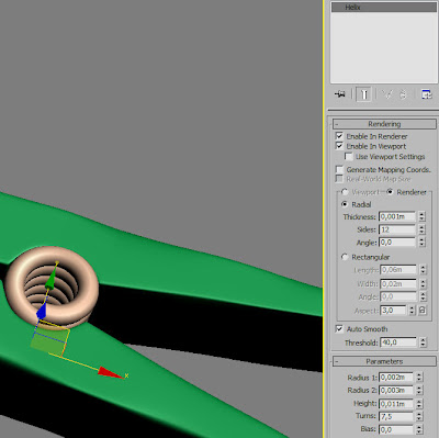 Hacemos una instancia y giramos la pieza creada. Pensaba que eran iguales, pero en mi caso una pieza es un poco más grande que el otro, simplemente ajustamos vértex para hacerla más grande. Sólo queda el muelle del centro. Creamos una línea tipo elix ajustamos radios y grosor de la línea para que coincida con nuestra referencia.