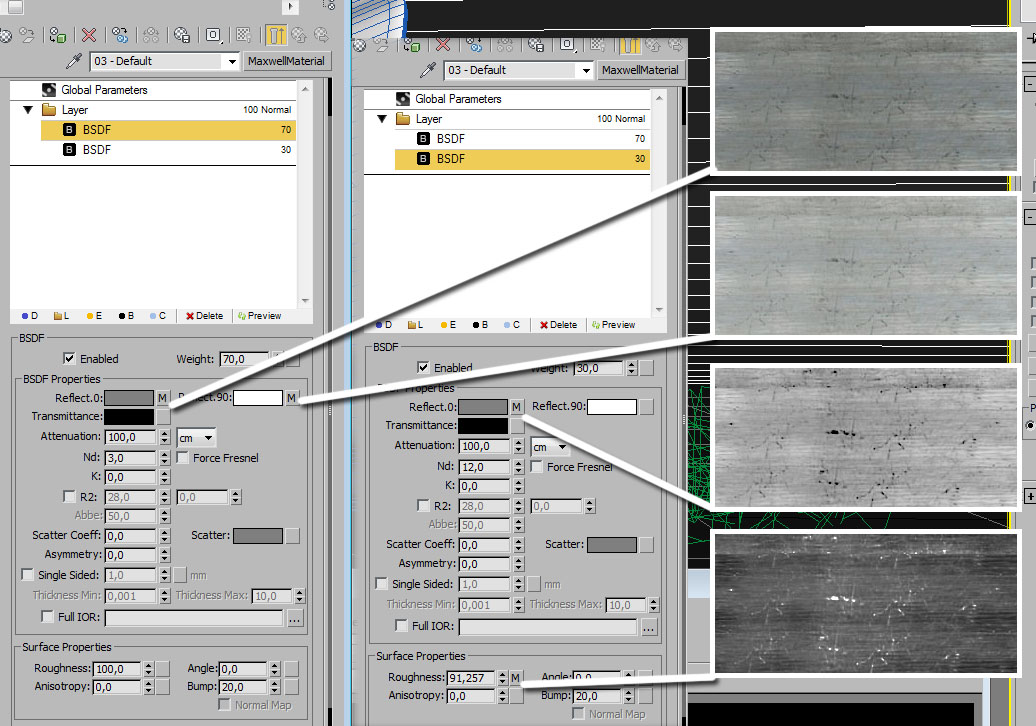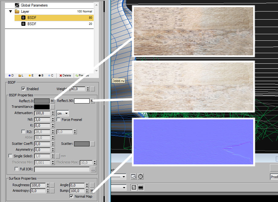 La primera capa bsdf (la de 80) quiere decir que tiene un peso del 80% sobre el otro del 20% (se fusionan las dos en este porcentaje), es la que don la información del color del objeto, se voz para que se en esta donde tenemos la textura de color en la casilla reflect 0 y porque el roughness es del 100% (este 100% significa que toda la luz se dispersa en diferentes orientaciones y por lo tanto, no brilla, si ponemos a 0 veríamos que la luz se refleja en una sola dirección y por lo tanto tendríamos un espejo, un 50% sería un blur reflection del Vray (reflejo burros). La segunda capa bsdf (la del 20) le da un pequeño reflejo en la madera, en ésta el roughness esta controlado por un mapa (podríamos prescindir de el y sólo tener el valor) que le don cierto reflejo, reflejar 0 tenemos una imagen en blanco y negro que nos dice que partes reflejan y cuáles no. Las dos capas tienen para dar relieve un mapa de Normal Map extraído con un plugin para Adobe Photoshop muy útil, lo ndo que puede conseguir gratuitamente haciendo clic en el enlace y tiene un tutorial muy bueno aquí.