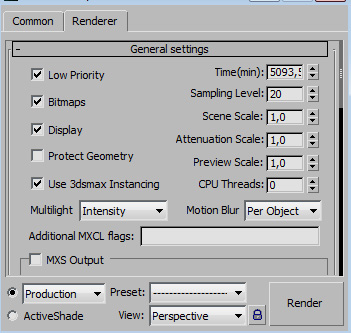 Si seleccionamos f10 y vamos a la casilla renders podemos tocar las opciones del motor de render. En general settings podemos tocar el time que es el tiempo que el programa esta calculando la imagen, cuanto más tiempo dejemos más nítida será. Lo normal es meter un tiempo muy alto y paramos cuando nos parece manualmente el render. El parámetro sampling level es un parámetro del motor de render referente a la calidad de la imagen. En cuanto llegue el render final al valor que colocamos se para el render (aunque no hayamos alcanzado el valor de time) lo normal es meter un valor alto y parar el render manualmente. Para tener una referencia, por imágenes exteriores con un SL de 12 es suficiente (no se ve grano). Para imágenes interiores (con mucha luz indirecta) o con imágenes con muchos materiales dieléctricos se suele tener que llegar a un SL de 18 o 20.