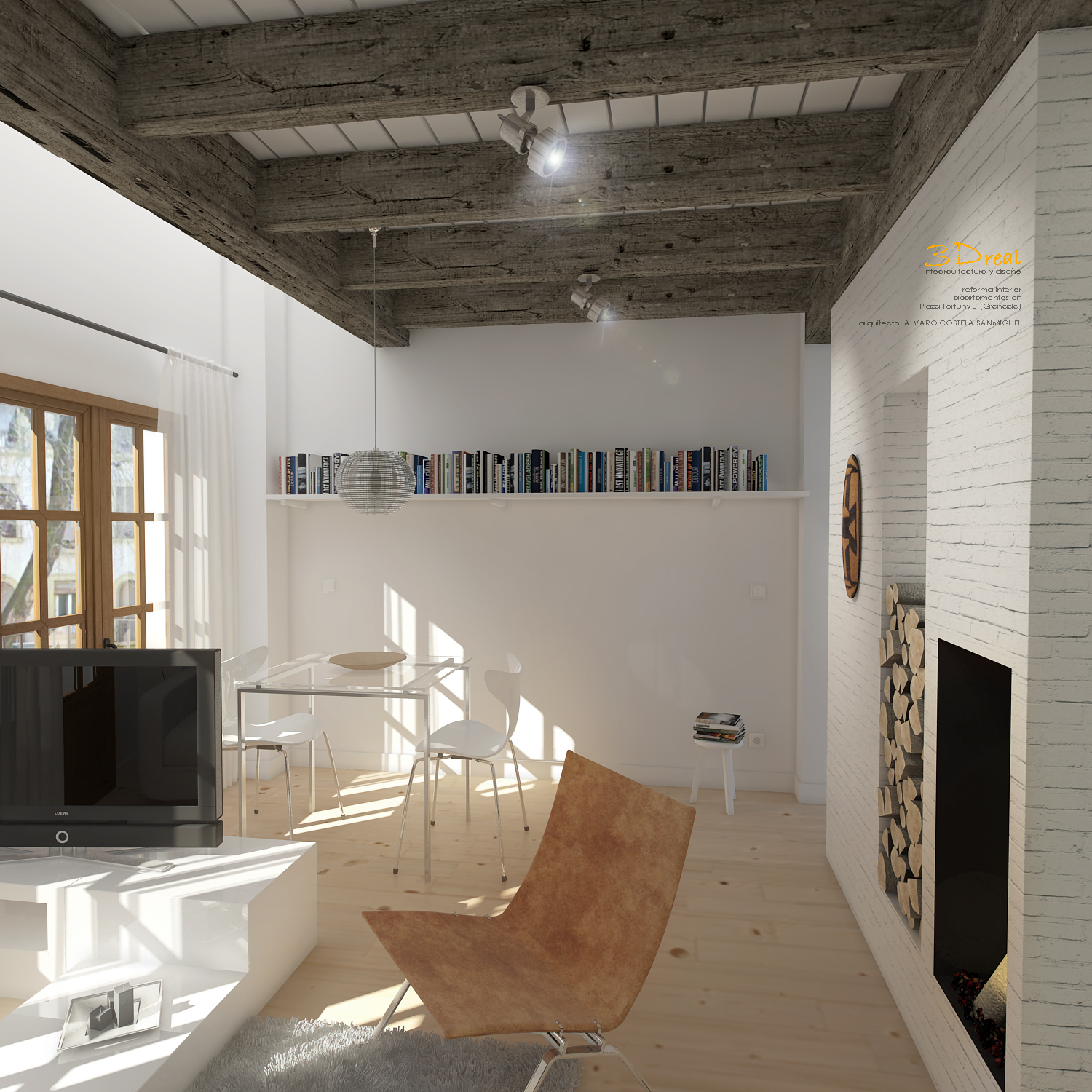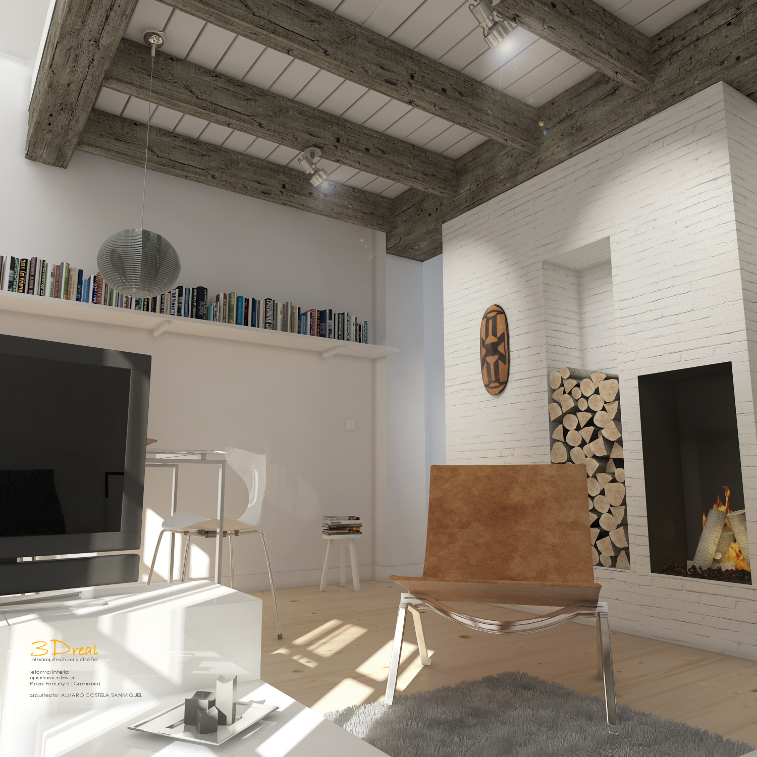 Bueno, pues vamos, allá. En el tema del modelado decirte que me parece correcto excepto los troncos de la chimenea que creo que no están a la altura del resto de la imagen. Y la silla de piel que parece que no tiene espesor.