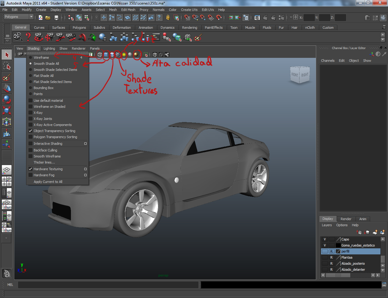 Buenas a todos. Soy joshuared y empiezo de cero con Autodesk Maya 2012 por lo que nos veremos a menudo aquí. Mi primera pregunta y como novato que soy, aunque mis primeros pinitos apuntan bien es que he creado una nave espacial, todo correcto, pero quiero verla sin las ¿líneas guía?