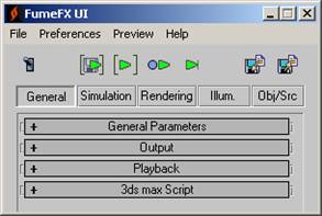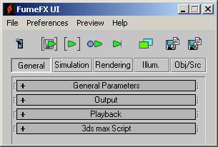Justo debajo de la barra de herramientas de la ventana flotante se encuentran una serie de cinco pestañas: general, simulation, rendering, illumination, y obj/src. Estas pestañas corresponden a los paneles de control principales para las simulaciones de FumeFX. Al hacer clic en ellas se abrirán los grupos de parámetros apropiados y te permitirán sumergirse en los detalles de la configuración y ajustar tus simulaciones de FumeFX.