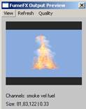 Archivo adjunto 207500preview - Al seleccionar este botón se abre la ventana de vista previa de salida. Puedes abrir la ventana de vista previa en cualquier momento desde esta barra de herramientas, la ventana flotante de la interfaz de usuario de FumeFX, o la ventana de estado de FumeFX. Si se abre durante la simulación es posible que tengas que esperar hasta que el fotograma actual se calcule para actualizar la imagen de la ventana.