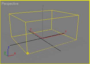 Una vez seleccionada, como cualquier otro objeto dentro de 3ds Max, basta con clickar y arrastrar el nuevo volumen a cualquier vista del viewport. Cuando hayas terminado, obtendrás una caja rectangular en alambre (wireframe) de color amarillo como la que se muestra a continuación.