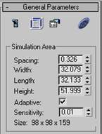 El desplegable general parameters, contiene los parámetros del área de simulación y el tamaño global de la rejilla. Este grupo de controles también está disponible en la ventana flotante, la diferencia es que en el panel modify, este desplegable también incluye la barra de herramientas principal - Que es el portal, de acceso a otras partes de la interfaz.