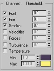 threshold scale - Este valor actúa como un multiplicador de los valores de umbral (threshold) individuales de cada canal. Para cada canal, el correspondiente controlador spinner, para el umbral (threshold) establece el valor mínimo que será mostrado en pantalla, en las unidades de FumeFX (humo, fuego y combustible), o unidades del mundo (velocidades y fuerzas).