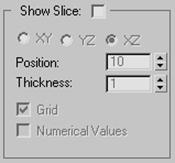 Casilla de verificación show slice - Si se habilita esta opción, podrás ver los valores de los fluidos en una intersección de la rejilla con un plano 2d especificado. Para ello, selecciona uno de los tres pares de ejes en el espacio local (xy, yz o xz), a continuación, ajusta los controladores spinner, de la opción position (posición) y thickness (grosor) para determinar la localización exacta mostrada.