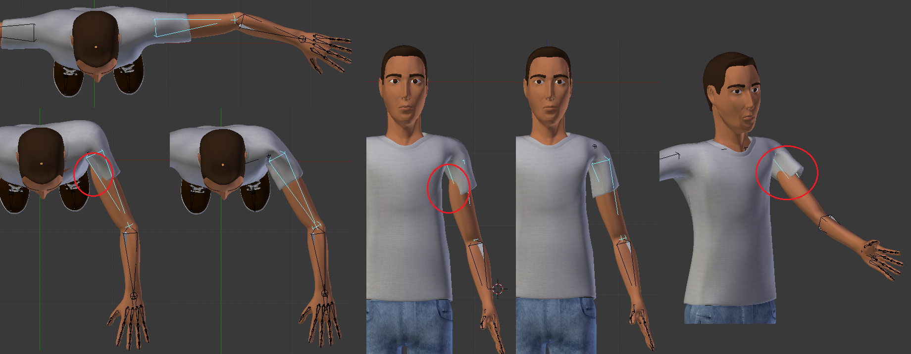 Pero sigo teniendo problemas con algunas cosas, como, por ejemplo, al bajar el brazo o moverlo hacía adelante no sé por qué se me mete la manga de la camiseta dentro del brazo. Así que para intentar solucionarlo he creado varios shape keys y les he asociado un driver y he conseguido corregirlo para cuando bajo el brazo o cuando lo muevo hacia adelante.