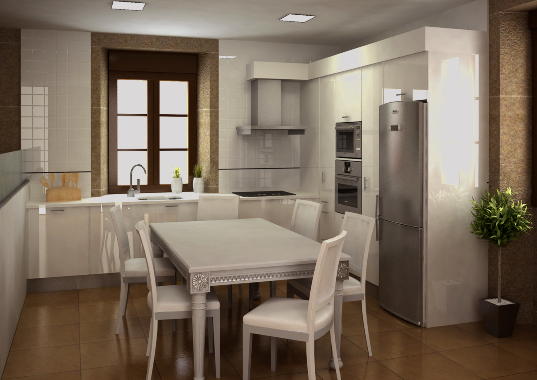 La mesa es muy grande para el reducido espacio de la cocina, sugeriría que le coloques una mediana y redonda saludos y buen render cuidado con esas quemaduras de luz en la derecha.