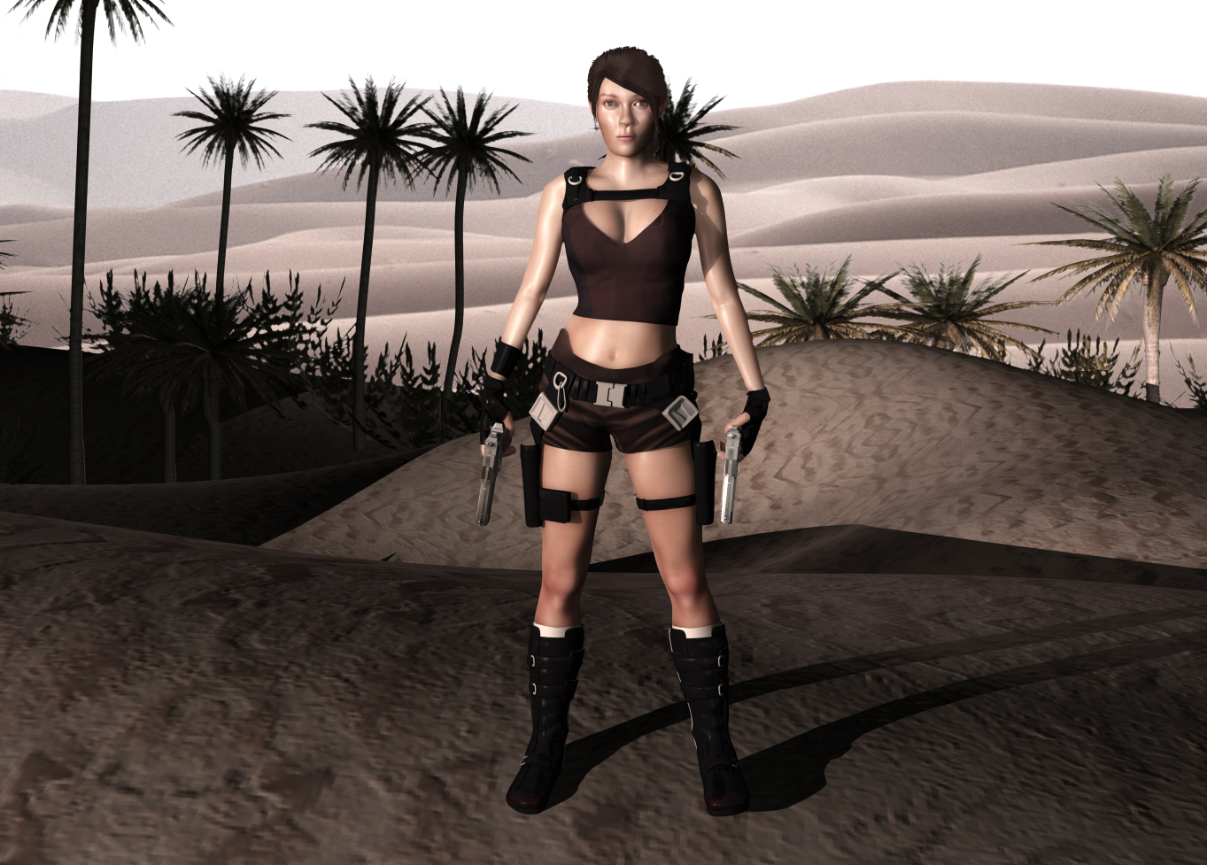 Pues sí, el cuerpo no está mal, pero la cara ha quedado un poco feilla, parece que está asustada. Por otra parte, el fondo no queda encuadrado con la escena y las dunas se ven demasiado planas, le falta relieve a la arena y en la zona más cercana se ve pixelado. Prueba con una textura más grande, la vegetación se ve bastante irreal.