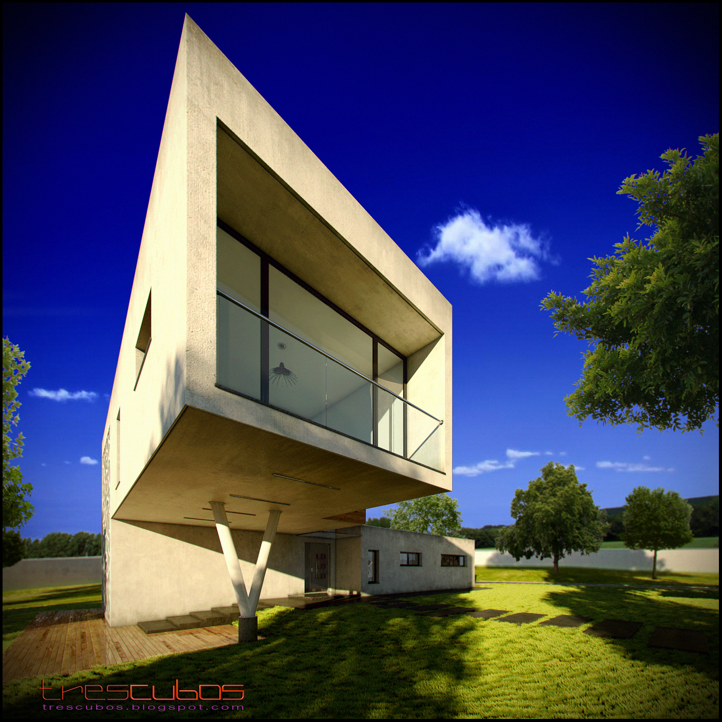 La arquitectura me gusta la iluminación me gusta mucho el ambiente es logrado es excelente las texturas en general muy bien logradas(excepto por el piso exterior de madera o de lo que sea, no lo entiendo muy bien), los puntos de vista de la cámara excelentes, el pasto tiene algo que no me gusta no sabría explicar exactamente que es, y en general toda la vegetación no se ve bien lograda más bien se ve mal, se notan mucho los recortes de los árboles de Photoshop también se nota mucho el recorte de la casa contra el entorno lo que le quita calidad en su integración con el mismo, el trabajo es bueno, pero lo podrías mejorar al punto de hacerlo perfecto. Saludos.