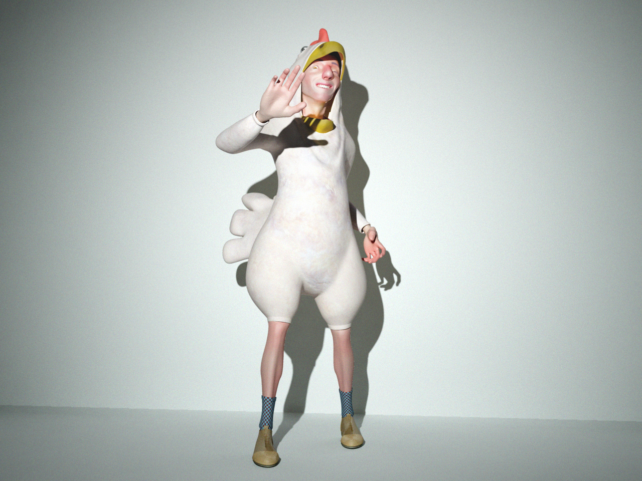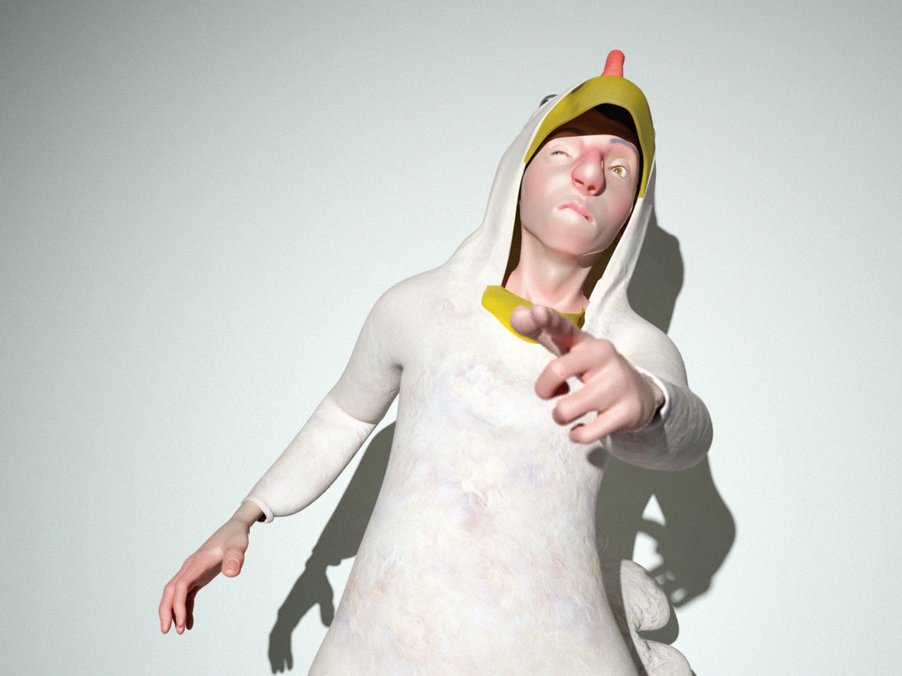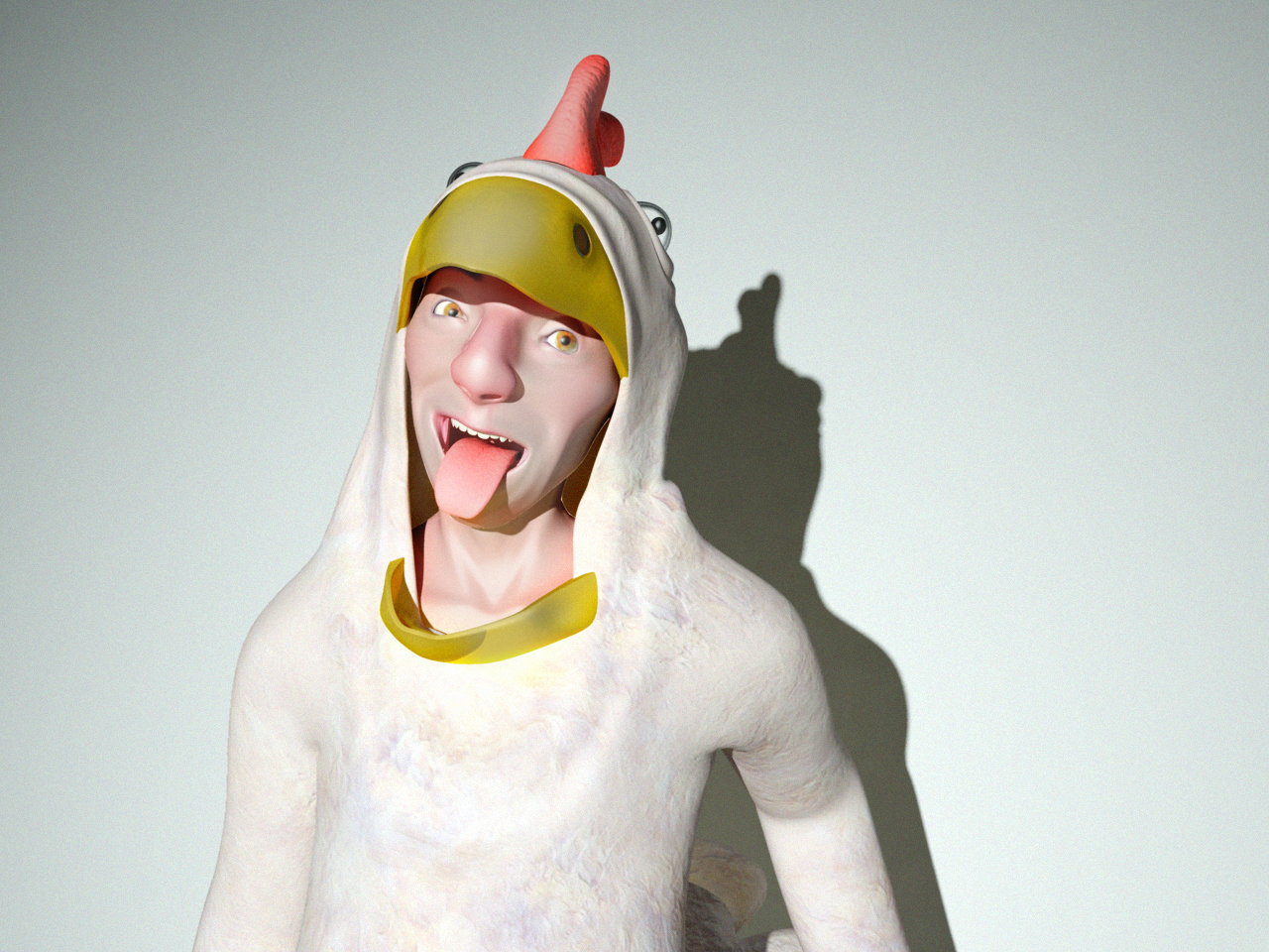 Me parece que está bien logrado en cuestión de modelado, pero personalmente le pondría un pase de Ambient Occlusion para resaltarle más las expresiones y darle más volumen. Eso es otro punto, me parece que la luz está un poco fuerte y quizás eso lo aplana un poco. Me gusta la idea del personaje, te inspiraste en el staff del cluckin bell de grand theft auto? Saludos.