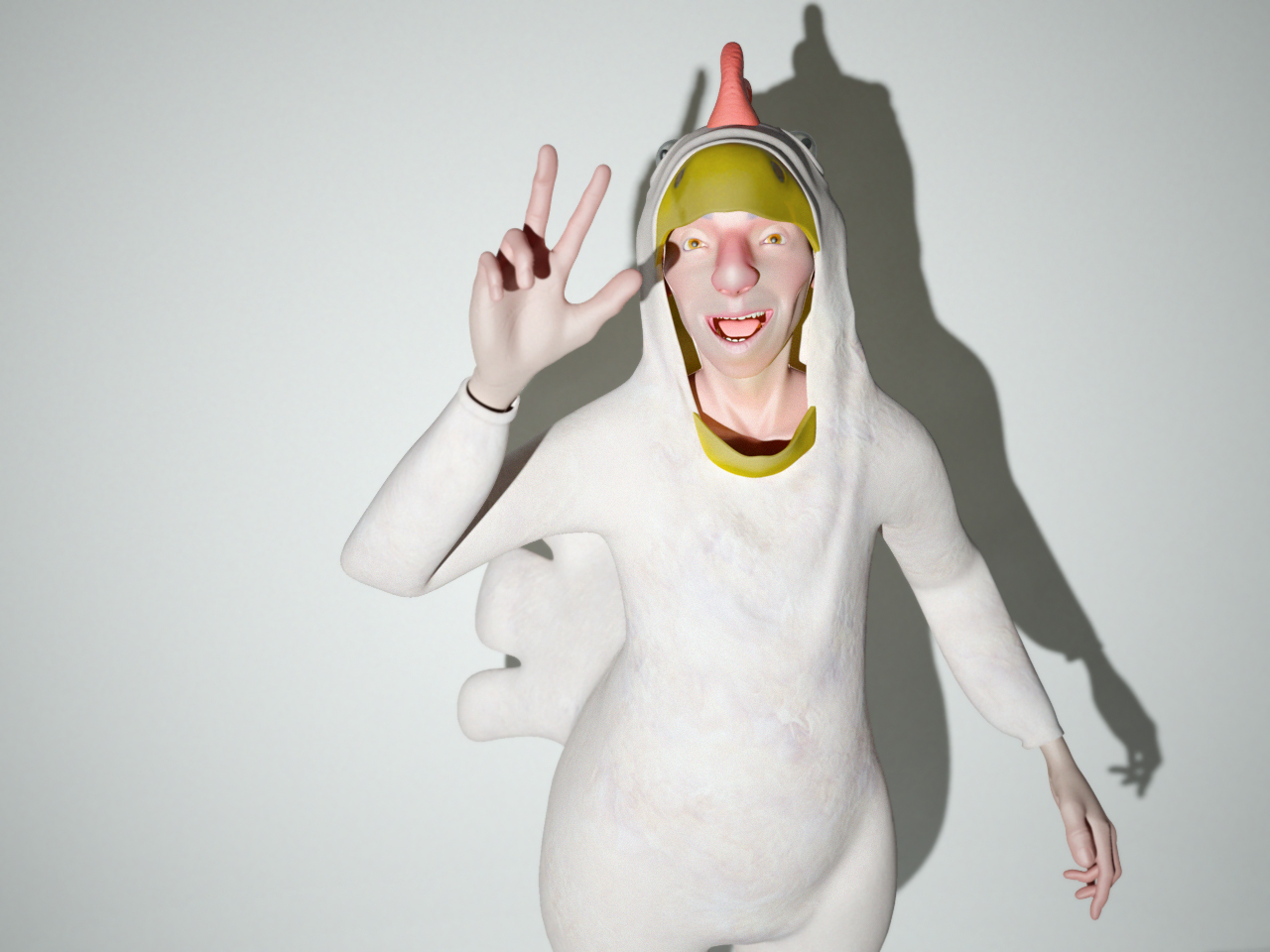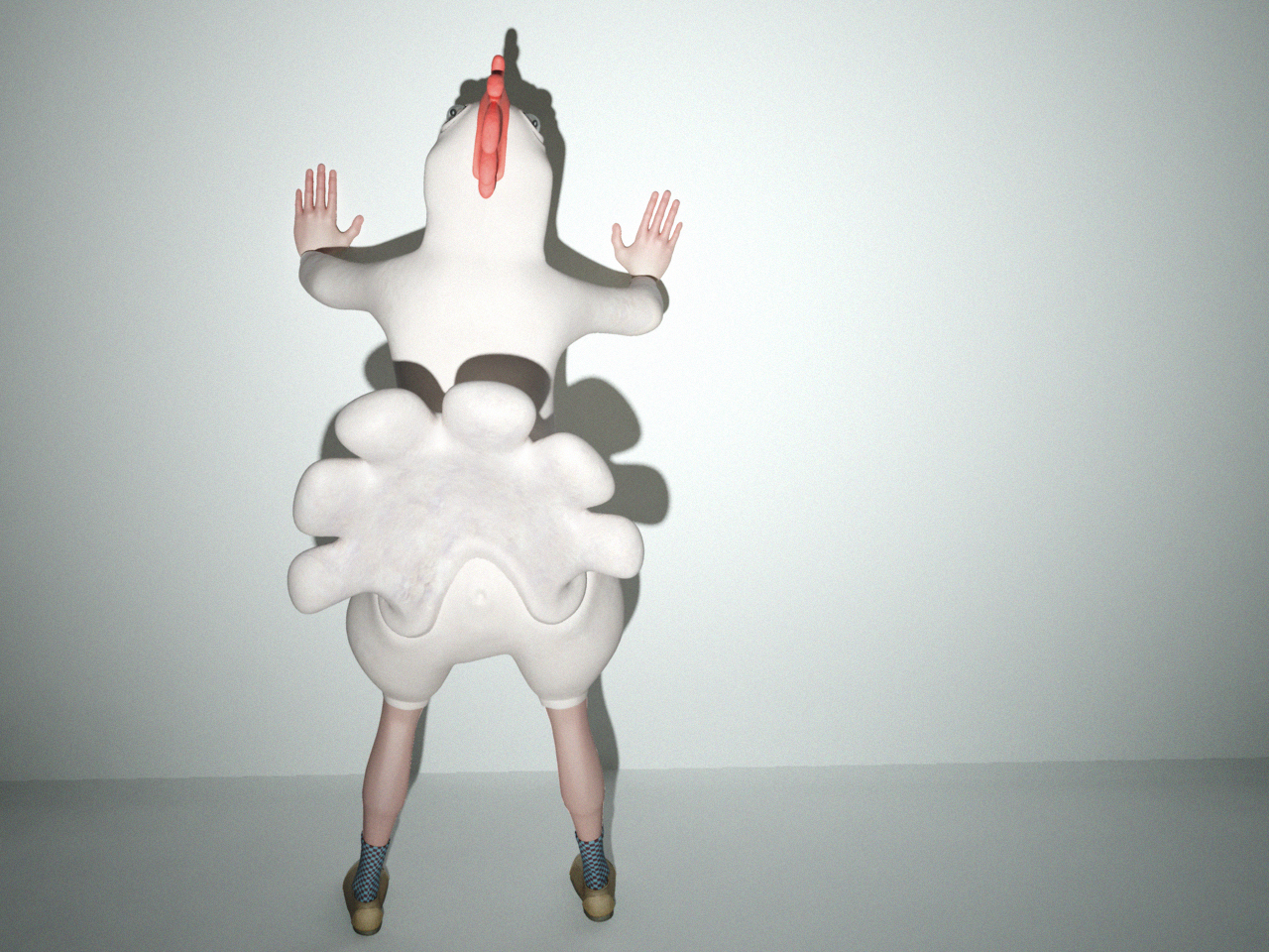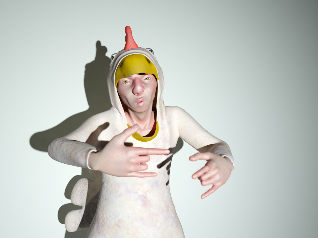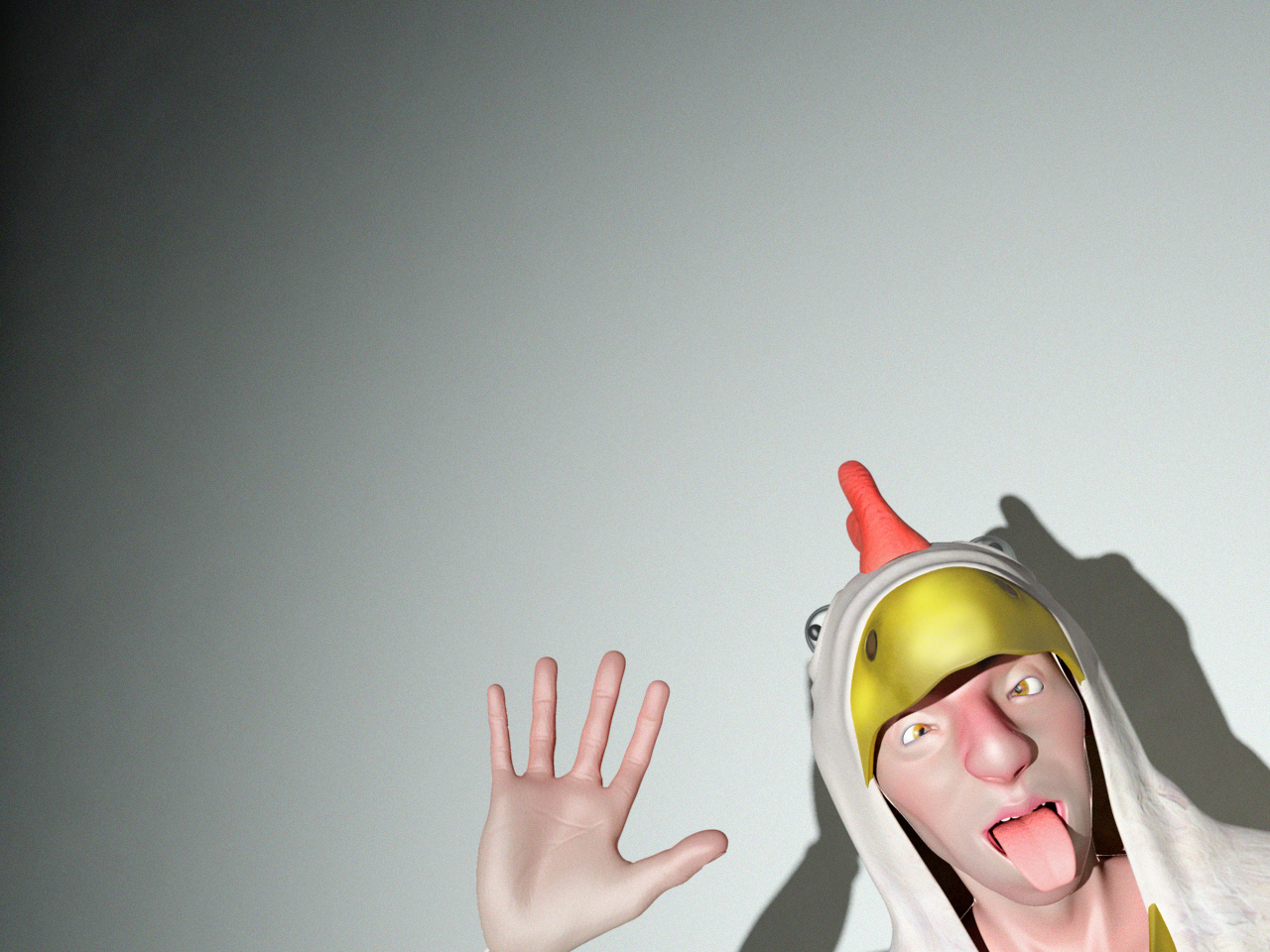Me parece que está bien logrado en cuestión de modelado, pero personalmente le pondría un pase de Ambient Occlusion para resaltarle más las expresiones y darle más volumen. Eso es otro punto, me parece que la luz está un poco fuerte y quizás eso lo aplana un poco. Me gusta la idea del personaje, te inspiraste en el staff del cluckin bell de grand theft auto? Saludos.