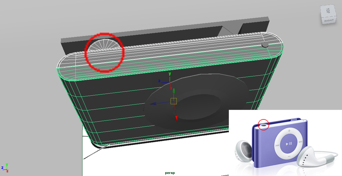 Estoy haciendo un IPod shufle, pero no sé cómo hacer la parte donde va el conector del audífono porque lo he hecho en partes separado, adjunto una imagen y subo el archivo de Maya 2010 por si alguien me ayuda.