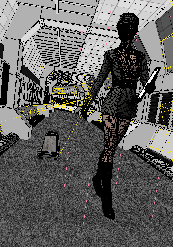 Es curioso, algo no me cuadraba, y hasta que no he visto el wire no me he dado cuenta de que es que las luces del arco del pasillo no son luces, sino que las has debido hacer en postproducción, y esas luces no iluminan ni se reflejan en el pasillo, eso era.