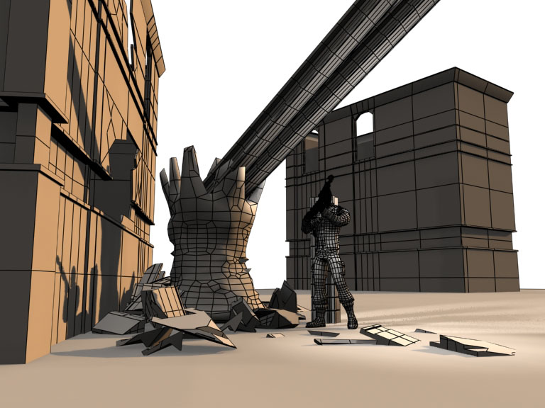 Muy bien. Como mejoras: en la imagen estática cuida un poco más la iluminación y no dejes el suelo tan vacío. Pon fragmentos de rocas y cosas, que no se vea que es un plano.