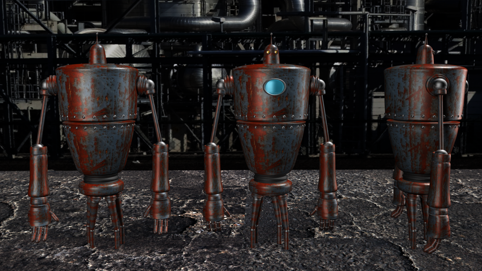Vaya no está mal el robot para ser tu primer trabajo. Como bien dices se pueden hacer más cosas en el, pero yo más que dedicarle mucho más tiempo a este lo que haría es añadirle unos pies a las patas (¿Qué pies? Eso ya es cosa tuya), creo que mejoraría bastante el conjunto del trabajo.